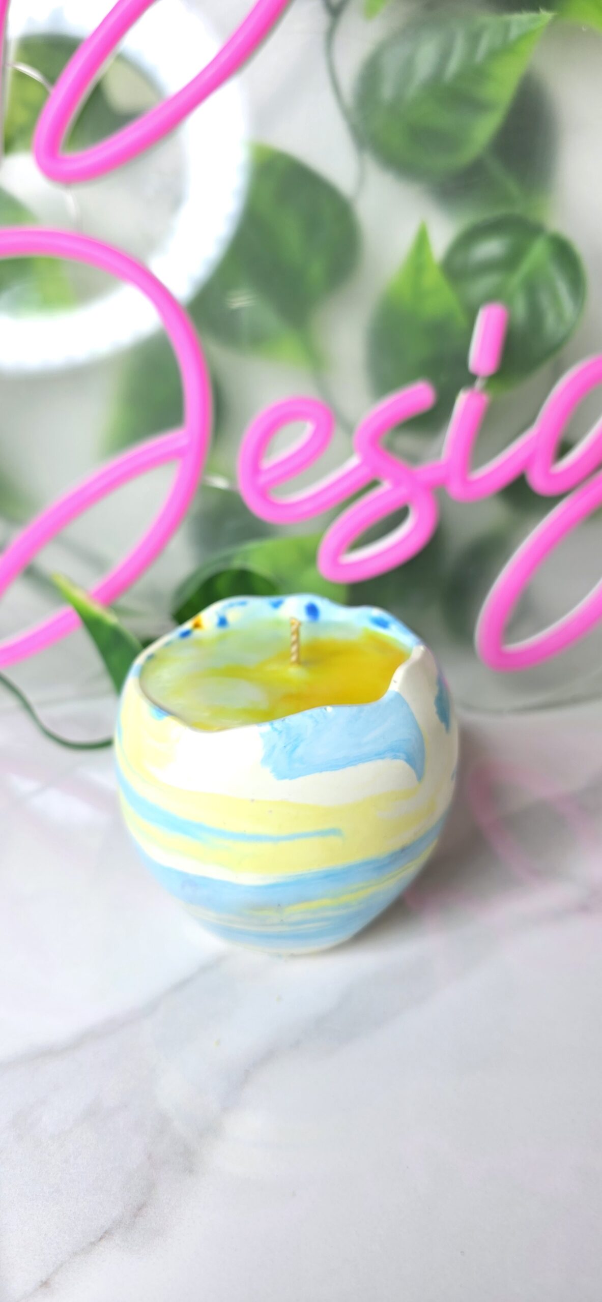 Svežina barv, umetniški dizajn in zapeljiv vonj v popolni harmoniji. Ta unikatna sveča je vlita v lonček iz keramičnega prahu v obliki jajca, v prelivajočih se modro-rumenih odtenkih, ki spominjajo na morje, sonce in brezskrbne trenutke.
